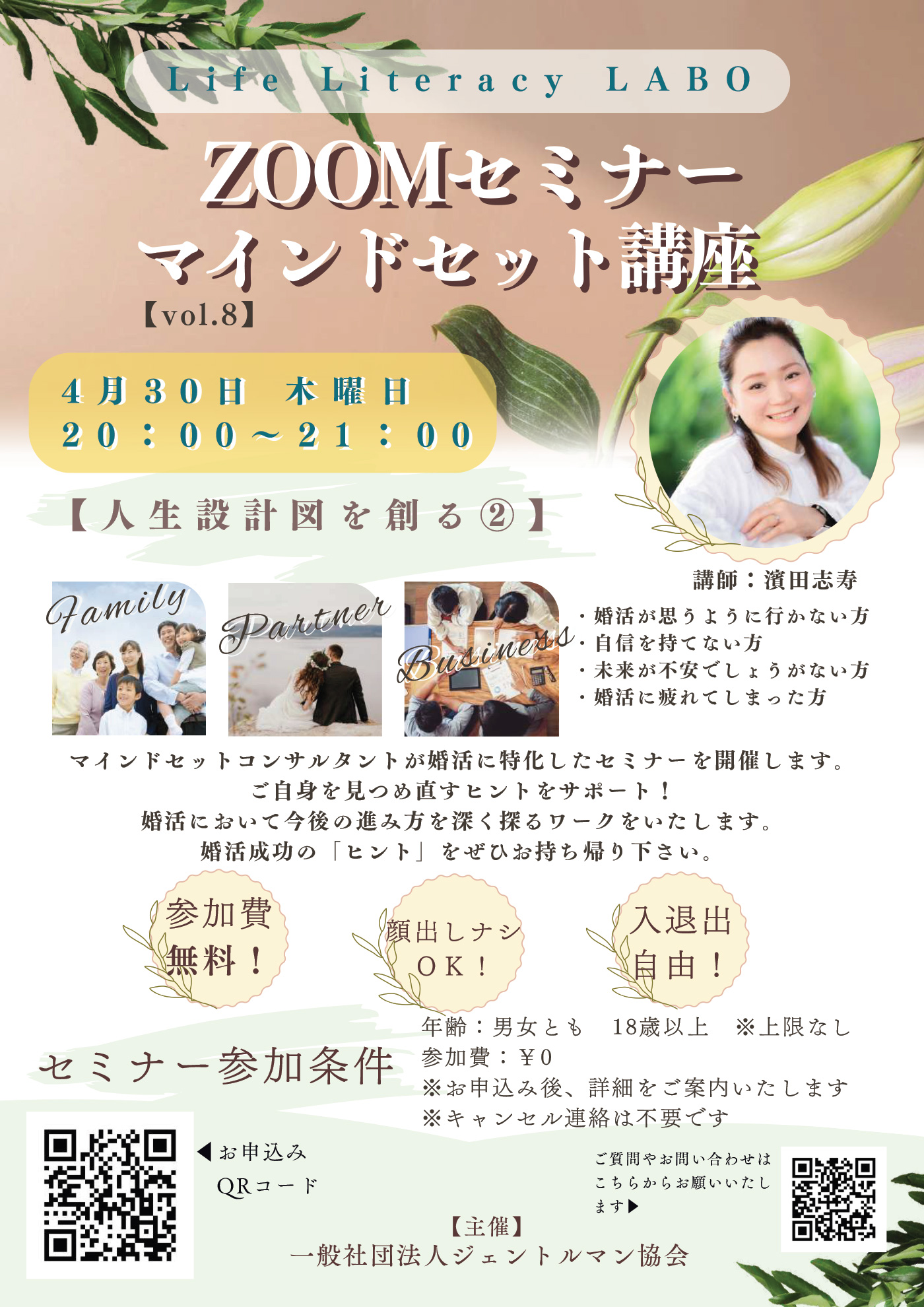 ご自身を見つめ直し、今後の進み方を深く探るワークをいたします。 ZOOM開催で顔出しはONでもOFFでもどちらでも構いません。 婚活成功の「ヒント」をぜひお持ち帰り下さい。 ※ZOOMセミナーマインドセット講座は月一開催を予定しております。 ※毎月テーマやワークは異なります。 ※継続学習を推奨しますが単発のご参加でも問題はございません。 ※小さくてもいいので新しいノートを1冊ご用意し、セミナーを「聞くだけ」ではなく、主体的に「参加」されることを強くお勧めいたします。 |