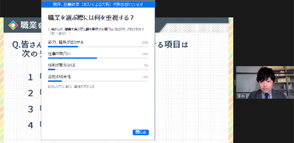 次にZoomの投票機能を使い、仕事・結婚・家庭に関する「問い」に答えるという、簡単なライフデザインのシミュレーションを行いました。仕事に関しては、「職業を選ぶ際に最も重視する項目は?」という問いに対し、複数の選択肢の中から自身の答えを選んでいただく時間を設けました。「仕事が面白い」「能力、個性が活かせる」という項目を選ぶ方が多く、実際の統計データにおける「会社の選択理由として、仕事の面白さや能力・個性が活かせることを重視する人が増加傾向にある」という結果と同じ特徴が見られました。参加者の投票結果を共有した後、就業/創業、新しい働き方、東京都の施策など、仕事に関するさまざまな情報の説明があり、参加者からは「なぜ働くのかという問いが印象に残った」「みんな働いているから働く、ということでは、人生の大きな選択の時に困ると実感した」といった声があがりました。